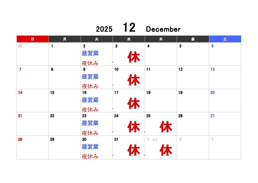*休日等変更がある場合がございます。必ずお電話でお問い合わせください。